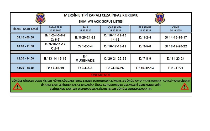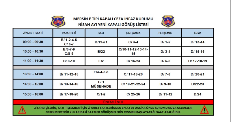 - Belirtilen gün ve saatler dışında görüşme yaptırılmayacak;bir defa görüş yapan hükümlü ve tutuklular ile ziyaretçilerine ,ikinci defa izin verilmeyecektir.