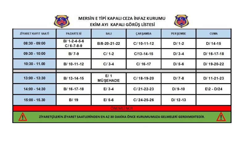 - Belirtilen gün ve saatler dışında görüşme yaptırılmayacak;bir defa görüş yapan hükümlü ve tutuklular ile ziyaretçilerine ,ikinci defa izin verilmeyecektir.